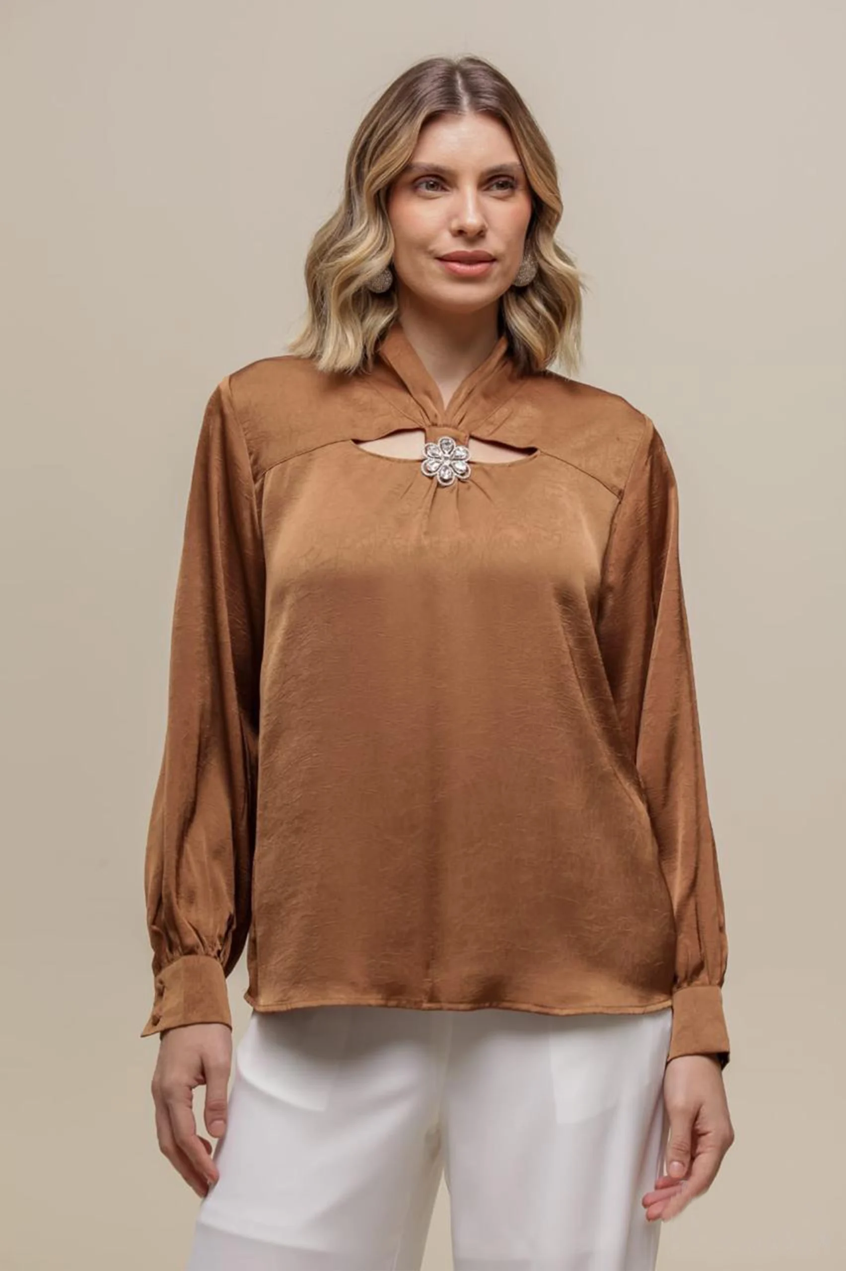 CAMISA MANGA LONGA MARROM C/ BROCHE