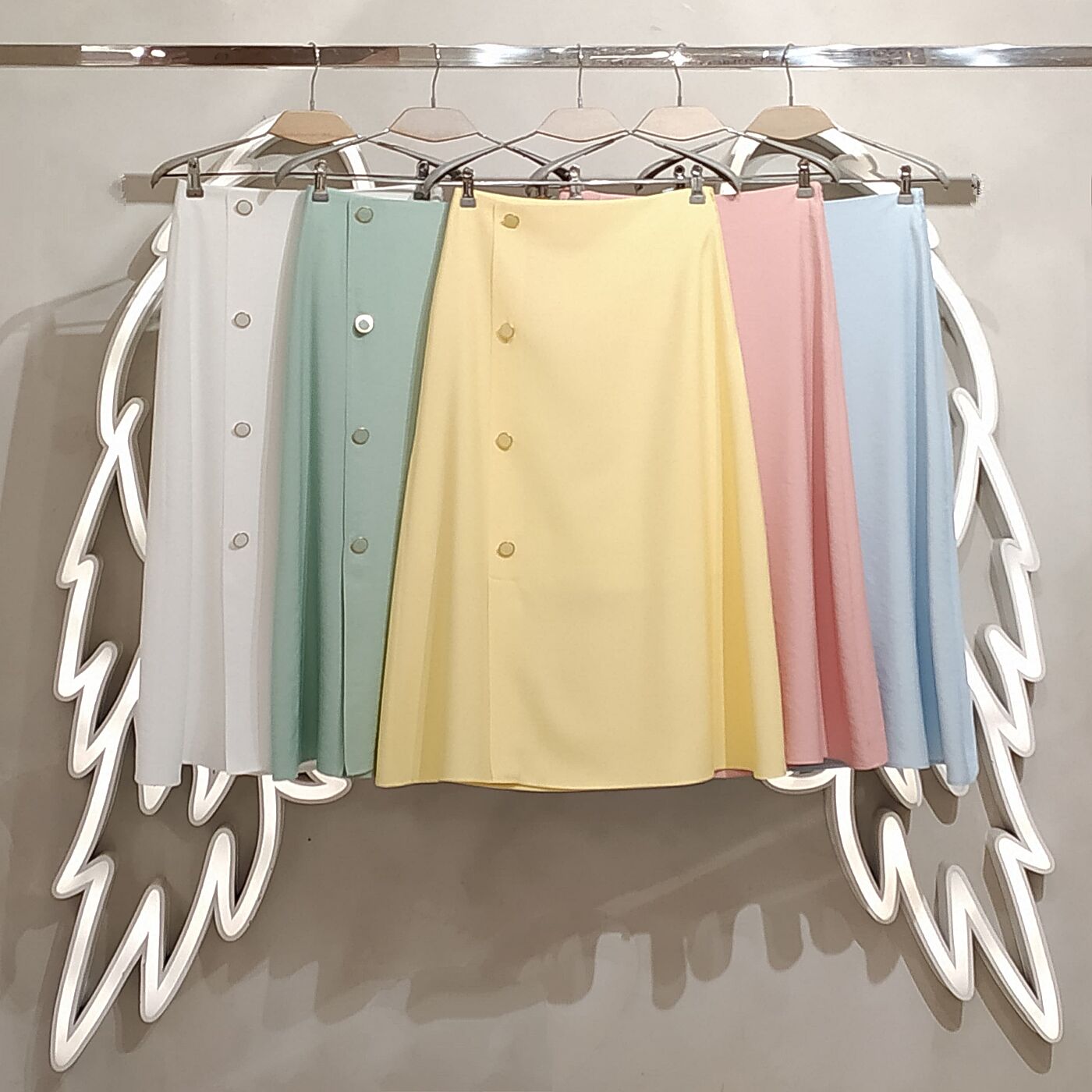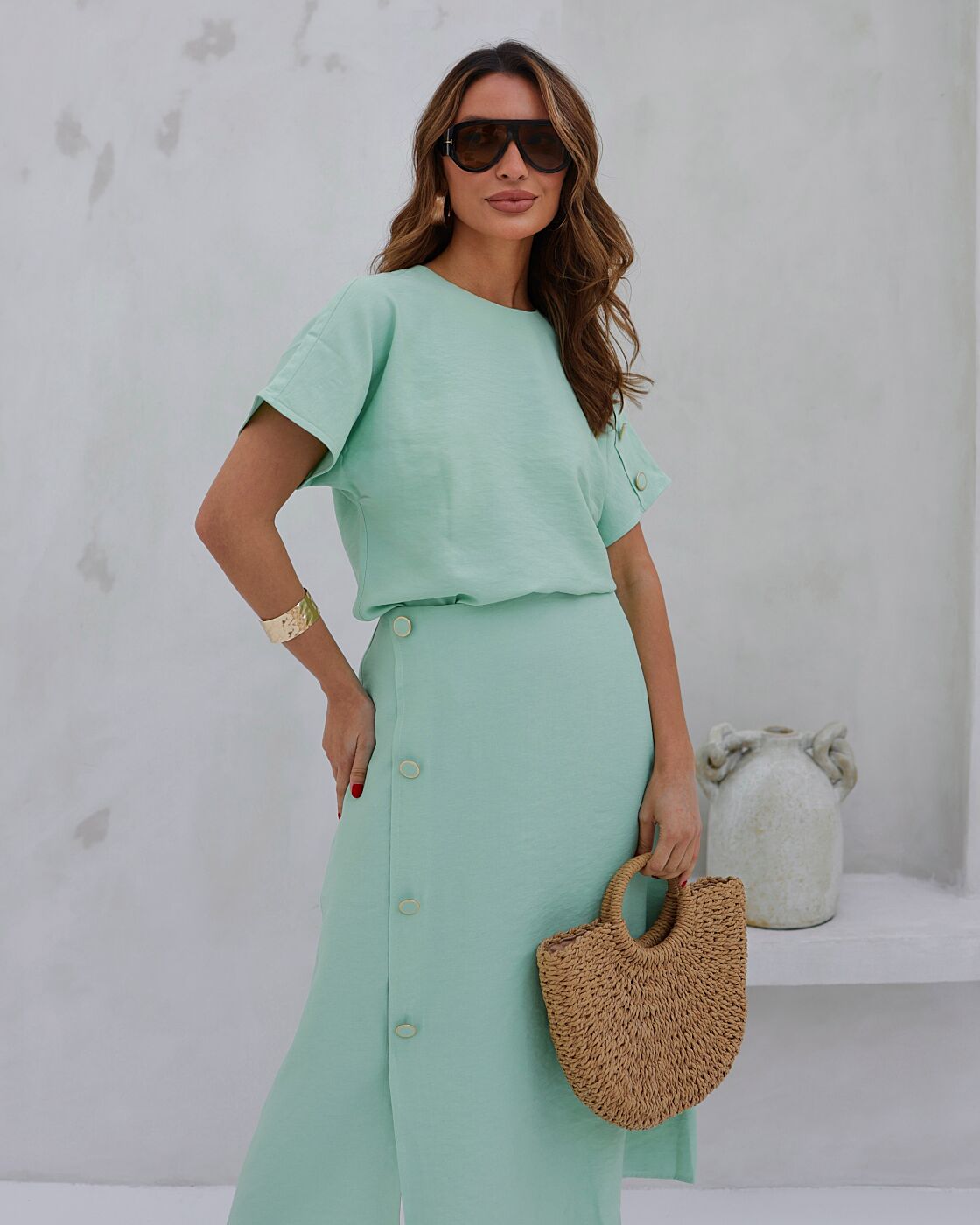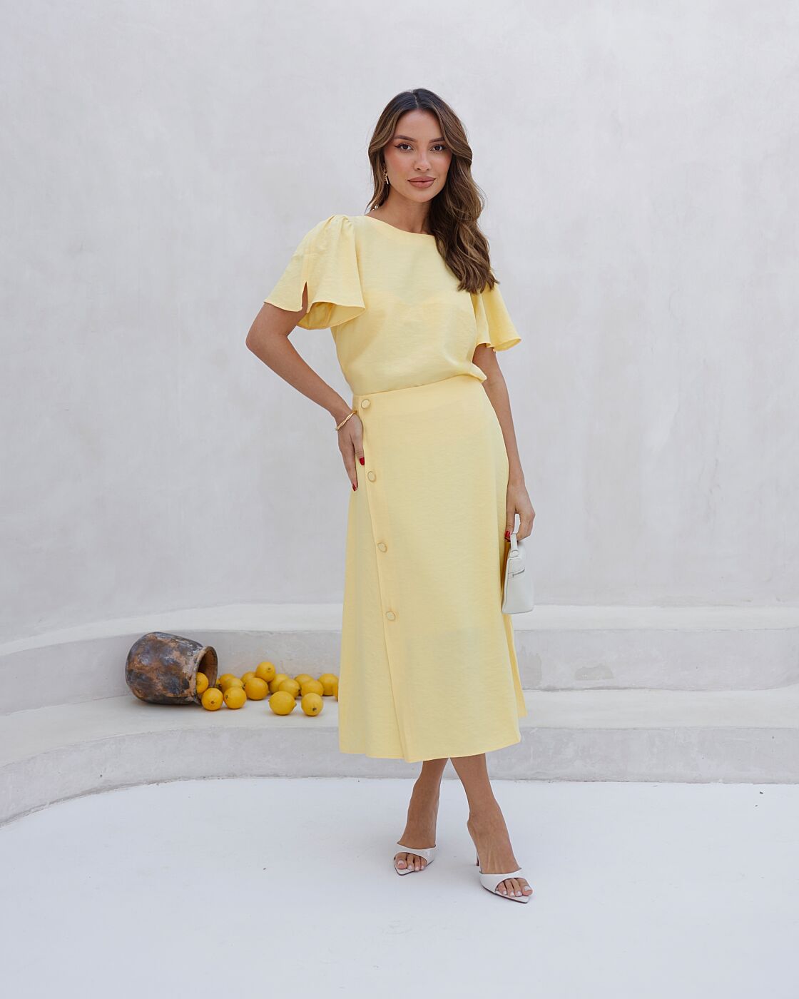 CONJUNTO DE BLUSA GOLA ALTA E UMA MANGA E SAIA MIDI POÁ