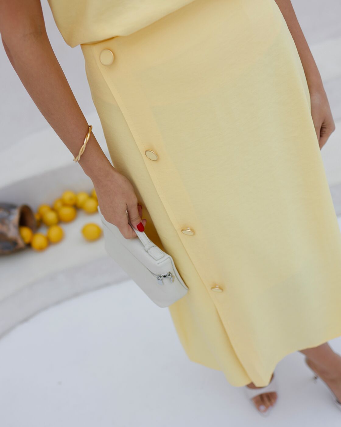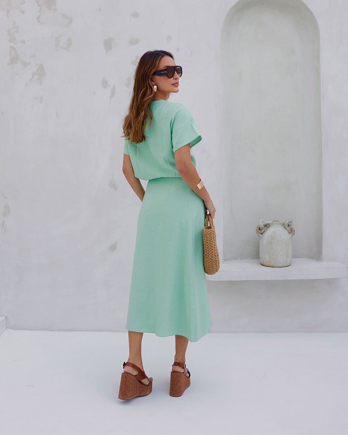 CONJUNTO DE SAIA MIDI ENVIESADA E BLUSA DE ALÇA